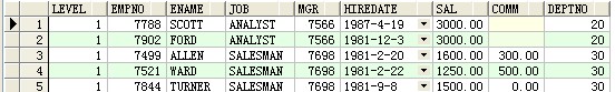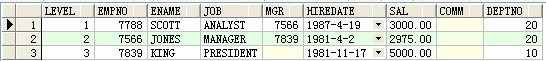 select level,emp.* from scott.emp start with ename='SCOTT' connect by prior empno=mgr;