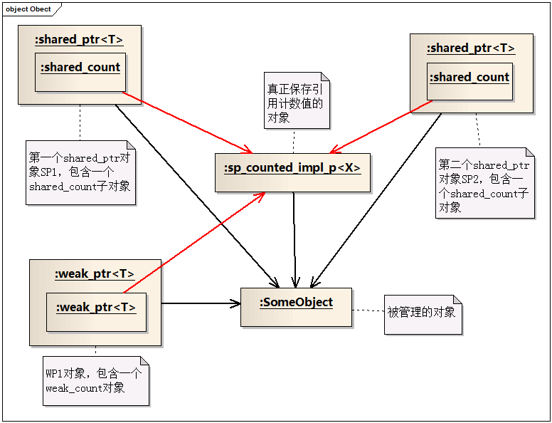 执行完以上代码后,内存中会创建以下对象实例,其中红色箭头表示指向引用计数对象的指针,黑色箭头表示指向被管理对象的指针。