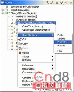 假如只需在 Outline 视图、Hierarchy 视图或任何您查看方法的地方选择方法 - 然后通过单击菜单选项,就可以将一个或多个方法设置成所期望的可视性 - 那么这会非常方便。诚然,我习惯了在我使用 VisualAge for Smalltalk 那段日子里学到的这一功能。图 1 显示了对 Eclipse 的 Java 开发环境中 Java 编辑器的 Outline 视图上下文的扩展。