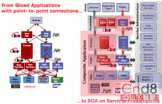 SOA的部分范例转移是一个从应用基础架构(Application InfrastrUCture)迁移到服务基础架构(Service Infrastructure)的过程。在SOA之前,各种应用程序用点对点的连接方式孤立地组织在一起。除了利用一个聚合的服务基础架构层(Service Infrastructure Layer)之外,SOA使用同样的后端应用引擎和中间件,如图1所示。