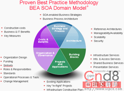 为了保证成功,SOA以一种新的方式要求IT和业务协同工作。开始SOA规划时,需要在技术性和非技术性要素之间进行有效的平衡。为此BEA开发了一个域模型(如图2所示),帮助指导您规划必须同等重视的六个要害方面,以确保成功实施。