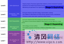 BEA的SOA成熟度矩阵(如图3所示)帮助监视SOA效果,这样您可以检查不同开发阶段的进度。这个矩阵被划分成三个阶段:探索(EXPloring)、扩展(Expanding)和开拓(Exploiting)。可以使用像BEA Online Self-Assessment Tool这样的工具来评估架构的成熟度。