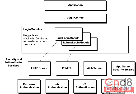 图一给出了JAAS的概览。应用程序层的代码只需要和LoginContext打交道。在LoginContext之下是一组动态配置的LoginModule对象,这些对象使用相关的安全基础结构进行验证操作。
