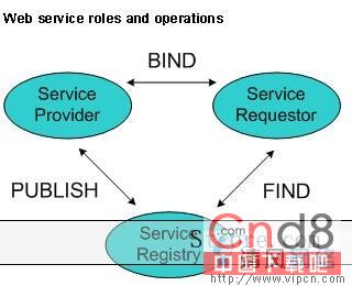 Web Service是独立的、模块化的应用,能够通过因特网来描述、发布、定位以及调用。在Web Service的体系架构中包括三个角色:服务提供者(Service Provider)、服务请求者(Service Requestor)、服务注册器(Service Registry)。角色间主要有三个操作:发布(Publish)、查找(Find)、绑定(Bind)。