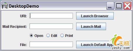 在启动浏览器、电子邮件客户端或任何应用程序之前,DesktopDemo必须确定是否你的平台支持这种API。然而,DesktopDemo首先停用所有的图形化的文本域和按钮。在确定该平台支持它们之后它该程序才启用这些图形组件。