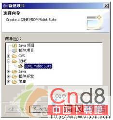 刚才创建的是MIDlet Suite,一般也称作MIDlet应用程序套件,可以包含一个或多个MIDlet,只是在发布时是以MIDlet Suite为单位进行。实质性的工作都是在MIDlet中完成的。因此,需要继续添加MIDlet到项目。在导航器上点击鼠标右键,从弹出菜单中选择"新建"、"其他"菜单项启动上图所示对话框,选择J2ME下的J2ME Midlet子项后进入下一步: