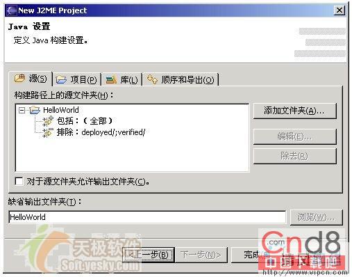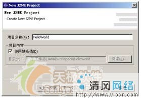 首先需要指定创建的是什么项目,展开J2ME项目,选中J2ME Midlet Suite子项后进入下一步。该向导页(如下所示)用来设置项目名称和项目存放路径。一般取缺省路径即可,项目名称自然是经典的"HelloWorld"了。设置完毕后继续下一步的设置。