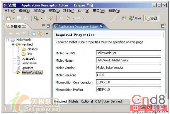 此向导页需要对应用程序所支持的MIDP版本进行指定。假如考虑兼容性的话可以选择J2ME Wireless Toolkit 2.1 MIDP 1.0 platform。当然也可以选择MIDP 2.0,但是目前支持MIDP 2.0的手机究竟还是少数。点击下一步对Java构建设置进行定义,通常取默认值就可以了。点击完成按钮后EclipseMe将会自动设置好项目的编辑及运行环境。可以在导航器视图中点击HelloWorld.jad项,在右侧编辑视图中将可以查看EclipseMe生成的项目结构: