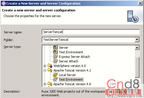 创建一个名为“TestServerTomcat”的 Tomcat 服务器项目。在此项目内,选择 New Server and Server Configuration,输入“ServerTomcat”作为服务器名(Server name),并且在“Apache Tomcat version 4.1”下选择 Test Environment 作为服务器类型(Server type)。在下一个面板中,指定 TOMCAT_HOME 作为安装 Tomcat 的目录,并且指定适当的 JDK 位置设置。请参见图 7。
