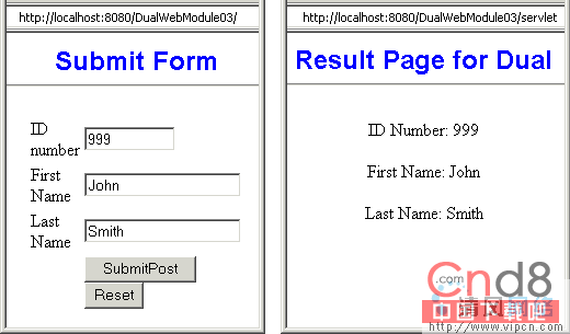 f.通过 Web 浏览器导航到 URL http://localhost:9080/DualWebModule03。您应该看到索引页面,带有显示的表单。