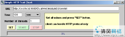 现在,我们将通过一个简单的 Java HTTP 测试客户端(通过下载的文件提供)来进行某些性能测试。测试客户端测量测试的持续时间内平均的响应时间和成功的采样数(即得到了响应的采样数)。要启动测试客户端(一个带有简单的自解释 GUI 的 Java 应用程序),可以运行 start.bat。该 URL 应该对将要测试的体系结构是有效地。选择 Set,然后选择 Start。当测试完成时,结果将显示在带颜色的文本区中。