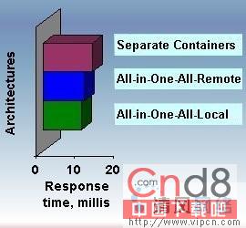 我们所进行的测试有两种类型:单线程和多线程(上述体系结构中的每一个都有 100 个线程)。为了获取可复验的结果,每种测试设置在客户端上都有一系列运行。在这些系列中第一次运行的结果被认为没有代表性,运行测试以使 JVM 和服务器“预热”。在每次测试运行之后便删除数据库 PERSON 表中的所有记录。单次测试运行一般持续的时间通常为 10 分钟。对于分离容器(Separate Containers)体系结构,为了进行多线程测试,Tomcat 的 server.xml 中的设置需要作如下调整: