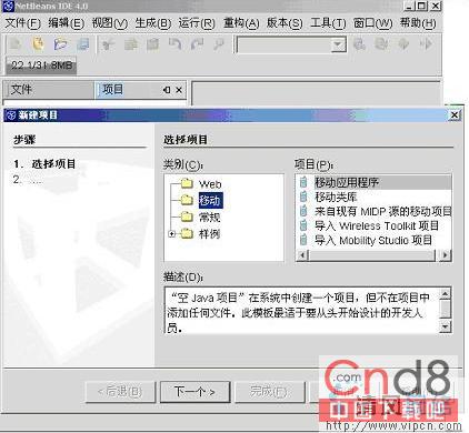 选中以后,你有三个选项进行选择,一个是Applet,一个J2ME,还有一个是J2SE。若你需要看事例则可以选择样例,若你要创建一个J2ME的工程则点击下一个。