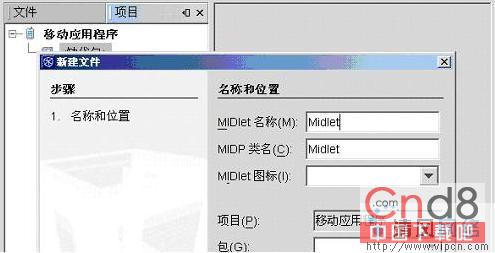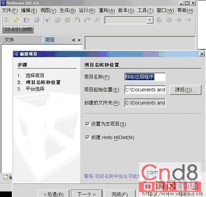 这时候它会提示你建立项目的名称,请最好不要用中文,因为会出现启动模拟器后又自动关闭的情况。你可以选择浏览在指定位置创建你所有工程的存放目录。其中有一个创建Hello MIDlet是一个事例程序,你可以不选择。