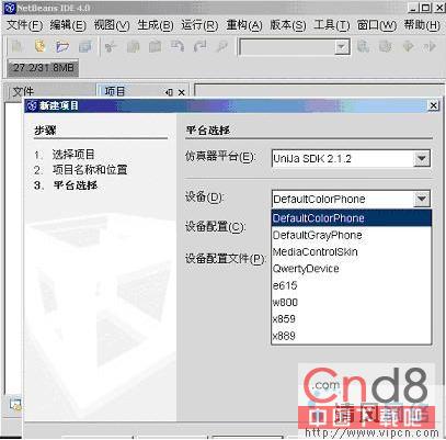 选择仿真平台就选择你模拟器的运行环境,因为我是在UniJa的基础上所以默认是UniJa的,联通的相关规范也上做了很多的说明。但就我看来其实变化是不大的,我在编写程序的过程中所读的源代码的例子大多是在Nokia的模拟器上的,但是我改了后依然可以在这上面运行,编写格式和语法格式应该没有什么太大的变化。设备就是你模拟器的样子,下面的有具体型号的就是CDMA的具体真机品牌。
