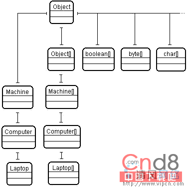 我们都对 Java 的类型层次结构比较熟悉:Java 有一组预定义的基本数据类型(int、float...),还有 Object 的子类的一个继续树,Object 类是所有类的最终超类。但 Java 中还存在一个不很出名的平行层次结构,我称其为数组层次结构。您无论何时在类型层次结构中定义了一个新类型 Foo,您实际上也同时定义了一个自动结合到数组层次结构中的新类型 Foo[]。数组层次结构中的每个类(基本数据类型的数组除外)都是 Object[] 的子类。轻易引起混淆的是:Object[] 和基本数据类型的数组都是 Object 的子类。图 1 表明了这一点。