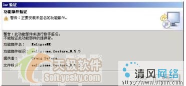 在这个页面中,将指定Eclipse插件要安装到的路径,可以点击"添加站点"选择其他路径,不过最好还是安装到Eclipse的安装目录下,确定点击完成即可。之后,系统会弹出如下界面以提醒用户目前安装的软件没有经过数字签名。这主要是由于目前EclipseME插件包没有通过数字签名而已(维持该签名需要400美圆/年)因此对于这个提醒不用担心,继续点击安装按钮以完成程序的安装。