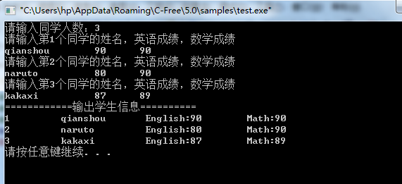 编写一个程序,要求先输入同学的人数,然后分别输入同学的学号、姓名和英语、数学成绩。