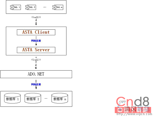 上图的一个要害点就在于ASTA Client与ASTA Server之间的那个“网络连接”,ASTA技术正是利用了网络特性,间接地屏蔽了不同数据库系统间的差别,使开发人员在设计DAL时完全不用知道Database的存在!这种情况有点像浏览器,完全不用知道Html页面是来自于IIS还是Apache,只需要知道自己是利用HTTP协议通过网络来获得HTML页面!