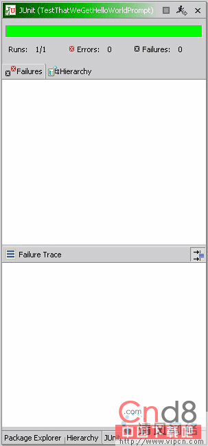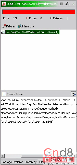 按照TDD规范,首次运行测试,应该故意让它失败。点击运行->运行为->Junit测试(记住TestThatWeGetHelloWorldPrompt.java应该被突出的显示在包资源治理器中)。在左边窗口,应该看见JUnit窗口而不是包资源治理器,它显示一个红条,一次失败的测试,具体的失败原因参看图2。假如没有自动显示这些内容,点击JUnit标签(在底部的左边)。
