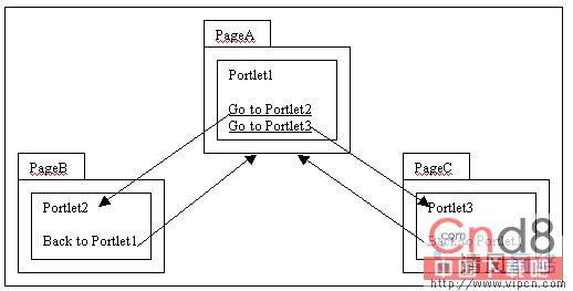 在样本应用程序中,我们将会使用位于三个不同页面的三个 portlet。当用户选择其中某一 portlet 中的链接时,该用户会被定向到另一个页面,其中驻留着另一个 portlet。在整个文章中我们开发和提到的示例都会利用多 Struts 模块将 WebSphere Portal 页面导航标记并入门户环境中每个模块本身的 JSP 文件中。图 1 概括性地展示了样本应用程序将如何工作;为了把重点放在理解这些方法上,我们特意简化了样本应用程序。在本文的后面我们将会提供给用程序的细节。
