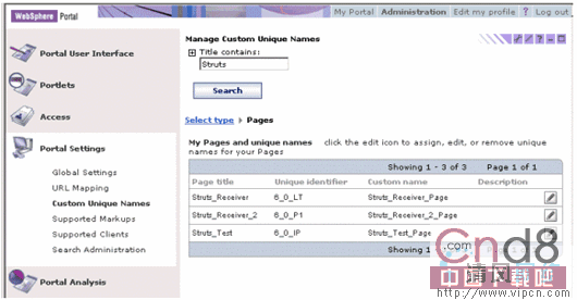 在 WebSphere Portal 中选择 Administration => Portal Settings => Custom Unique Names。我们使用 Custom Unique Names 治理 portlet 来获取为 contentNode 属性指定的门户资源的惟一标识符。治理员可以使用 Custom Unique Names portlet 来查看惟一标识符并为门户资源分配(让人易读的)自定义名称。图 2 显示了这些已配置的样本页面的惟一标识符和自定义名称: