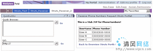显示了两个用于将用户请示定向到包含电话号码或地址信息的页面上的链接,它位于 Struts_Test 页面(自定义名称:Struts_Test_Page),如图 3 所示: