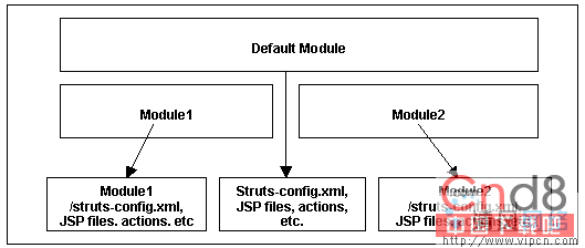 Struts Version 1.1 可以让我们将单个 Struts 应用程序拆分为多个模块,每个模块都有自己的操作、JSP 页面和 Struts 配置文件(图 6)。在 Struts 应用程序中实现多 Struts 模块需要以下几个步骤: