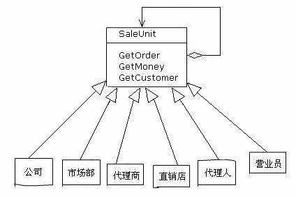 我们可以设计一个类,叫做销售单位(SaleUnit)。这个类是他本身的一个聚合,可以通过一个集合成员访问到他下属的单位。并且他的每一种下属单元也是SaleUnit的子类。各种销售网点统计数据的方式是不同的:有的数据保存在数据库表里面,经过一些统计运算可以得到;有的直接放在数据表的某个字段里面,直接查出来就可以了;还有的是每天发过来的一个Excel电子表格。对于每一种不同的销售网点,都可以使用一致的接口对他们进行访问,得到需要的数据。