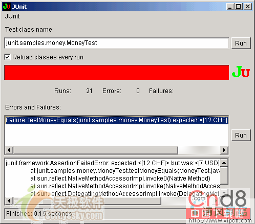 Error and Failures:列出了测试错误和失败的列表,点选其中的一个选项时,JUnit在窗口底部列出错误跟踪迹。