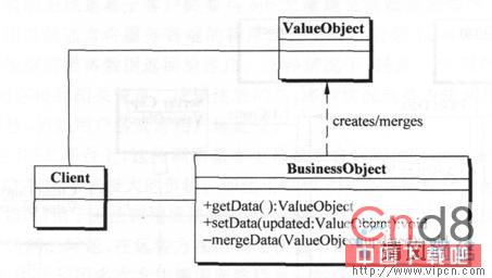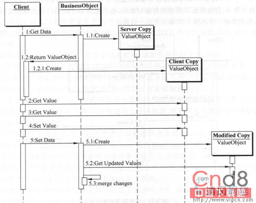 当用户调用业务对象的变值方法时,该方法会将用户端的传输对象序列化,再将它发送给业务对象;业务对象接收到更新的传输对象,便将这些更新写回到自己的对象拷贝中去; 这里需要说明的是,上面提到的写回只是涉及到被更新的变量,而不是全部变量的写回,因此我们需要在传输对象中另设置一个变量,来指定哪些成员变量被用户更新过,这也就使得这种模式的设计相对复杂,开发人员需要考虑同步化和版本控制的问题。