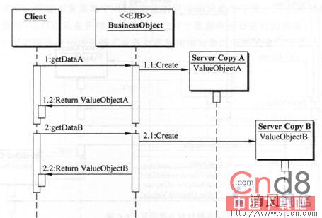 当一个用户需要A类型的传输对象时,他会激活相关EJB的getDataA()方法来取得传输对象A;当他需要B类型的传输对象时,他会激活getDataB()方法来获取传输对象B;依此类推。序列图18表示了这一过程。