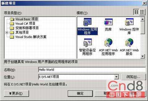 (6)、在【位置】的文本框中输入【E:VS.NET项目】,然后单击【确定】按钮,则Visual Studio .Net会按照上面设定的参数创建一个Windows应用程序项目,具体如图03所示。