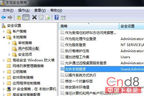点击开始菜单Logo,在“搜索程序和文件”处输入“secpol.msc”,回车打开“本地安全策略”对话框,双击打开“用户权限分配”,并在右侧窗口中找到并双击“允许在本地打开”(如图1)。