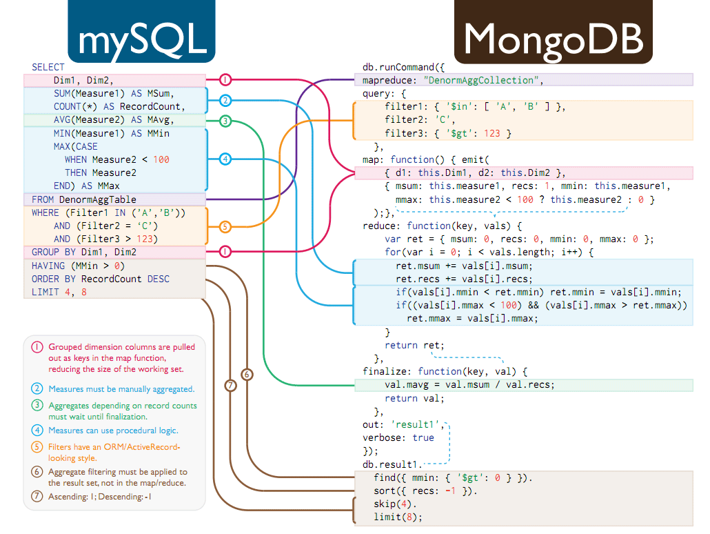 下图是使用 SQL 和 MongoDB 的对应信息图表,点击图片查看大图: