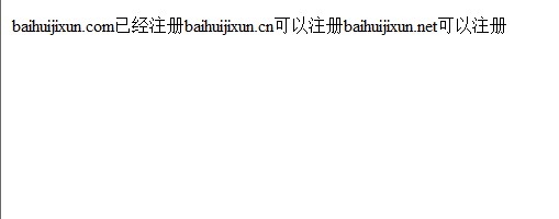 万网域名注册查询接口(API)的说明 1、域名查询 接口采用HTTP,POST,GET协议: 调用URL:http://panda.www.net.cn/cgi-bin/check.cgi 参数名称:area_domain 值为标准域名,例:hichina.com 调用举例:http://panda.www.net.cn/cgi-bin/check.cgi?area_domain=hichina.com 返回XML: HTML代码<?xml version="1.0" encoding="gb2312"?><property> <returncode>200</returncode><key>2zher3r3r.com</key> <original>210 : Domain name is available</original> </property> [Ctrl+A 全部选择 提示:你可先修改部分代码,再按运行] 返回 XML 结果说明: returncode=200 表示接口返回成功 key=***.com表示当前check的域名 original=210 : Domain name is available 表示域名可以注册 original=211"" : Domain name is not available 表示域名已经注册 original=212 : Domain name is invalid 表示域名参数传输错误 2、域名信息whois 接口采用HTTP,POST,GET协议: 调用URL:http://whois.hichina.com/cgi-bin/whois 参数名称:domain 值为标准域名,例:hichina.com 调用举例:http://whois.hichina.com/cgi-bin/whois?domain=hichina.com 返回文本:其中在字符《pre》与字符《/pre》之间即为域名信息内容。