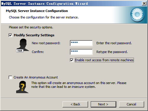 强烈建议为你的MySQL服务器设置一个root密码,默认情况MySQL Configuration Wizard(配置向导)要求你设置一个root密码。如果你不想设置root密码,不选中Modify Security Settings(修改安全设定值)选项旁边的选择框。
