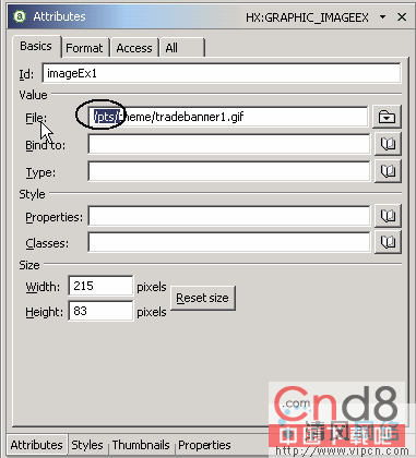 为了本次练习的目的,转到 Attribute 视图,然后删除 file 名称字段中的 /pts/ ,如图 20 所示,这样,最后得到的相对路径如图 21 所示。(进行此修改的目的是避免工具的 Beta 版本工具中关于绝对路径名和页面模板的错误;否则,将不能正确解析 tradebanner1.gif。)