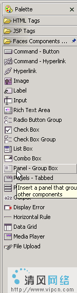 假如您不在 Web 透视图中,现在就转到它。确保 StockTemplate.jtpl 是打开的。您将会在工作台的右面看到 Palette。Faces Components 部分包括标准的 JSF 组件以及一些 IBM 扩展组件。展开 Faces Components 部分,然后选择 Panel-Group Box 组件。(图 12)