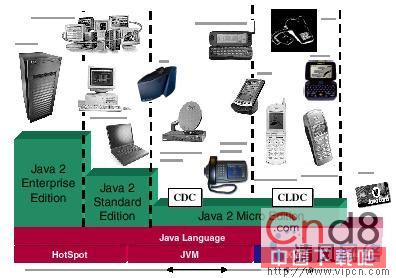 粗略的说j2me把设备分为两类,一种是联接设备( connected device),一种是有限联接设备(Connected, Limited Device)。前一种对应于那些有电源的,电力充裕,较大的设备。例如:电视机,冰箱等,后一种对应于主要使用电池,小型的设备,例如:手机,pda等。