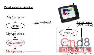 CLDC要求其下层的虚拟机能够辨别并拒绝非法的class文件。但由于CLDC本身面向小内存消耗的小型设备这一前提。其类文件检测机制与J2SE中定义的标准类文件审核机制还有所不同。请注重看下图: