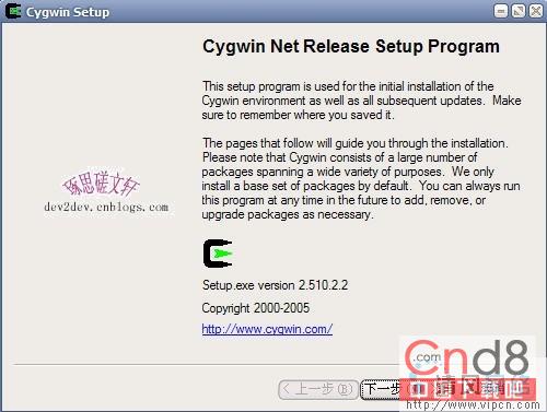 首先,我们去http://www-inst.eecs.berkeley.edu/~instcd/iso/下载到Cygwin软件的ISO文件,用Daemon软件将其设为虚拟光驱后,双击其中的Setup文件,出现程序安装的向导界面(如图1所示)。