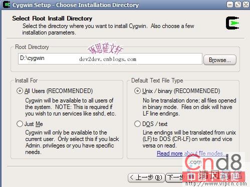 安装向导要求选择Cygwin的安装路径,我们可以在“Root Directory”文本框中更改安装路径,点击“下一步”,如图4所示: