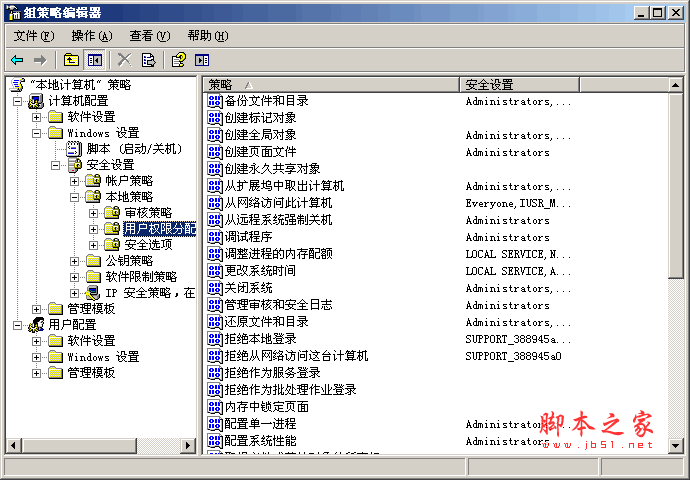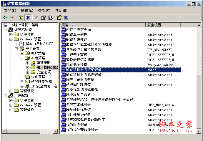 安全策略-->本地策略-->用户权限分配-->通过终端服务拒绝登录,在里面添加想要禁止远程的用户可以达到让这个账户无法远程