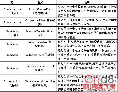 Sun Java Center的J2EE型式针对的就是n层业务系统,并且根据驻留的层而分类为:Presentation、Business和Integradon。下表1显示了此分类中的一些更常见的示例型式。