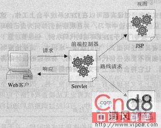 图1显示了一个前端控制器如何实现一个客户和多个视图之间的中介。这种中介可能是应用程序中一个工作流的一部分,也可以是在语言或者其他因素基础上的一个选择。