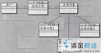 图4显示了一个会话正面如何控制对多个实体bean的访问并且提供一个对客户统一的接口。会话正面虽然一般用作基层实体EJB的一层掩护,但一个会话正面既可以从其他会话EJB访问服务和数据,也可以从数据访问对象(Data Access Objects)来访问。这些类之间的关系如图4所示。