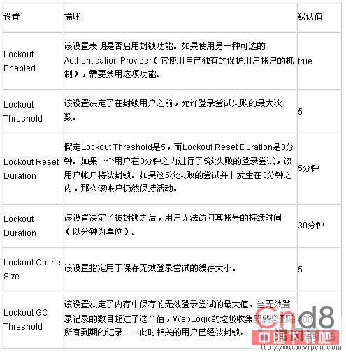 WebLogic提供一种用户封锁功能,以防止用户帐号的滥用。当一个用户尝试登录失败的次数达到一个阙值时,该用户就会被封锁。当这种情况发生时,该用户将被封锁一段时间(时间长短可以配置),或者直到治理员解锁该用户为止。在这期间,该用户被禁止使用这些证书访问服务器。为配置用户封锁,需要选择Administration Console左侧窗格中的Security/Realms节点下的安全域。然后,可以使用User Lockout选项卡来调整封锁功能,并查看封锁统计信息。