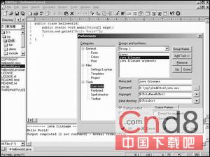 EditPlus是共享软件,它的官方网址是:www.editplus.com。最新版本是EditPlus 2.12。EditPlus也是功能很全面的文本、HTML、程序源代码编辑器。默认的支持HTML、CSS、PHP、ASP、Perl、C/C++、Java、JavaScript和VBScript的语法着色。通过定制语法文件还可以扩展到其他程序语言。可以在Tools菜单的Configure User Tools菜单项配置用户工具,类似于UltraEdit的配置,配置好Java的编译器Javac和解释器Java后,通过EditPlus的菜单可以直接编译执行Java程序。配置及运行示例如图2所示。