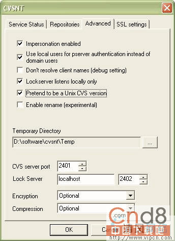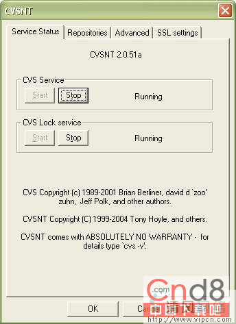 首先我们要正确安装并配置好CVS服务器,通常Linux Server都自带CVS服务,不过命令行操作比较繁琐。Windows下也有简单易用的CVS服务器,这里我们推荐CVSNT,可以下载CVSNT 2.0.51a,安装并启动CVSNT: